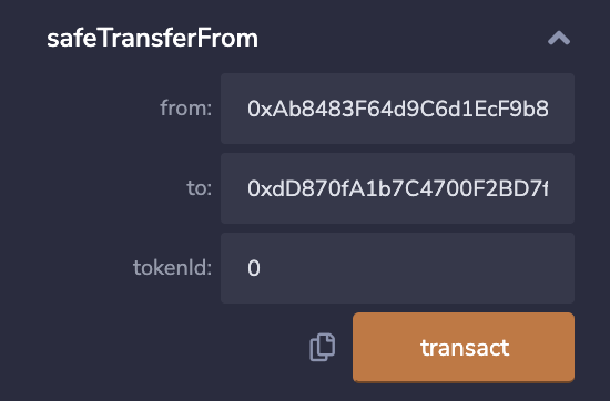 toにコピーしたアドレスを、tokenIdに数値を入力して"transact"ボタンを押すと…
