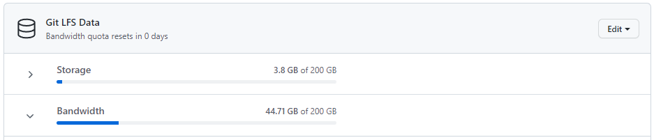 弊社のプロジェクトでもLFS含めて合計で3GB程度のリポジトリ(Unityで生成されるキャッシュを含めると10GB超)のため、あっという間に以下の画像のように、二週間程度で購入したデータパックを使い切るような状態になってしまいました。