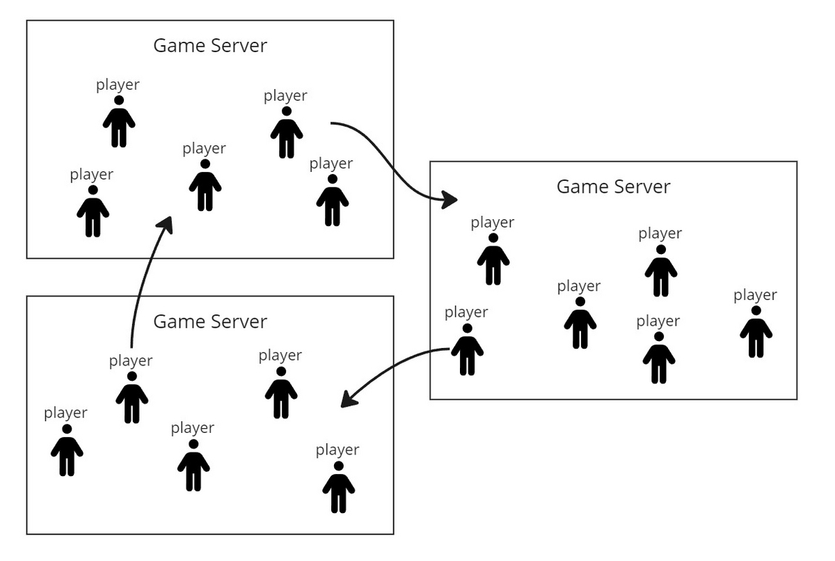 MMORPGではマップやワールド、エリアという概念でプレイヤーの集団を分割し、同様の構成を持つ複数のサーバーを分散管理・運用する方式が主体になっています。これによって、ゲームサーバーを跨ってもそれぞれのプレイヤーと物理的な位置の待ち合わせができ、ある程度クライアントサーバー間の通信量を減らす仕組みを持つことができます。
