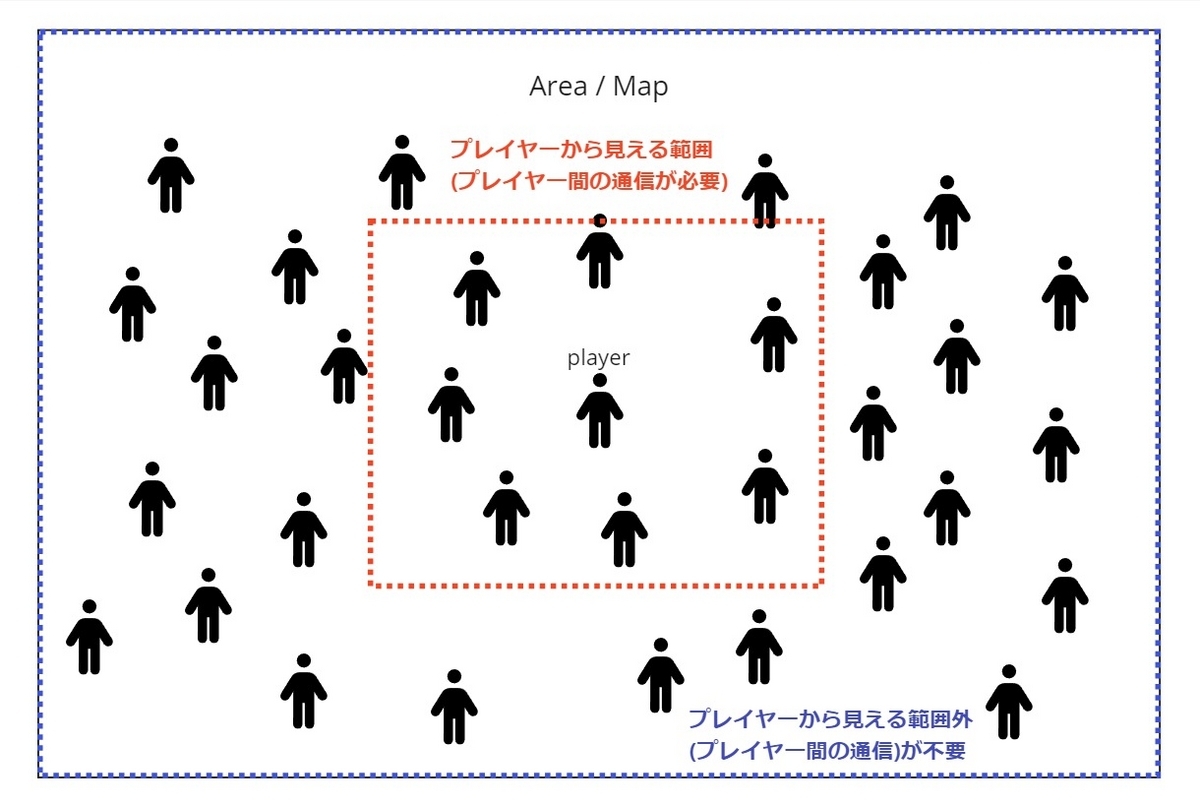 ただし、サーバーが抱えるエリアやマップが広大かつ、そのエリアに参加しているユーザーが多い場合、各々のプレイヤーがエリアにいる全プレイヤーと通信を行うと通信量が膨大になるため、プレイヤー毎に影響がない通信を極力絞る必要があります。