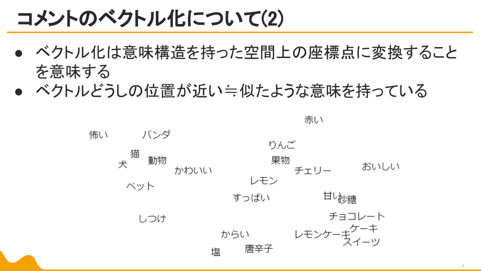 特徴量(スペックのような概念。ものを説明するときに特徴をカテゴリ分けして表すもの)とBERT(人力では特定の難しい特徴量。機械学習においてはベクトルの多次元データで表現される)についての軽い説明の後、コメントのベクトル化についても説明いただきました。