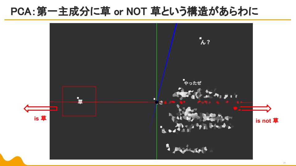 草か、NOT草かがまず第一主成分として現れてきました!!!これは流石に草。