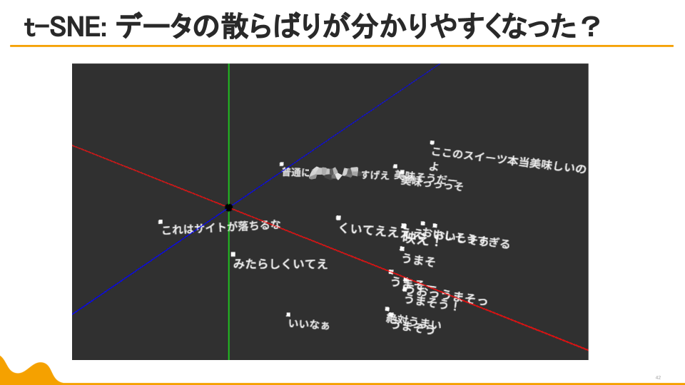 しかし、データの散らばり方や、似た属性の言葉の位置感は非常にわかりやすい結果に。