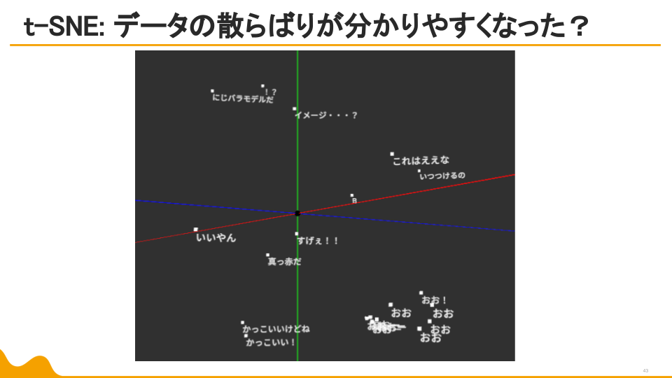 今後は友好的なユーザーコメントの傾向を分析して、配信者が行う特定イベント時(配信者の発言など)に自動的に応答するBOTを作ったり、3次元までデータを落とさずに、可視化・分析する手法について調べたいということで、次回以降も楽しみです!